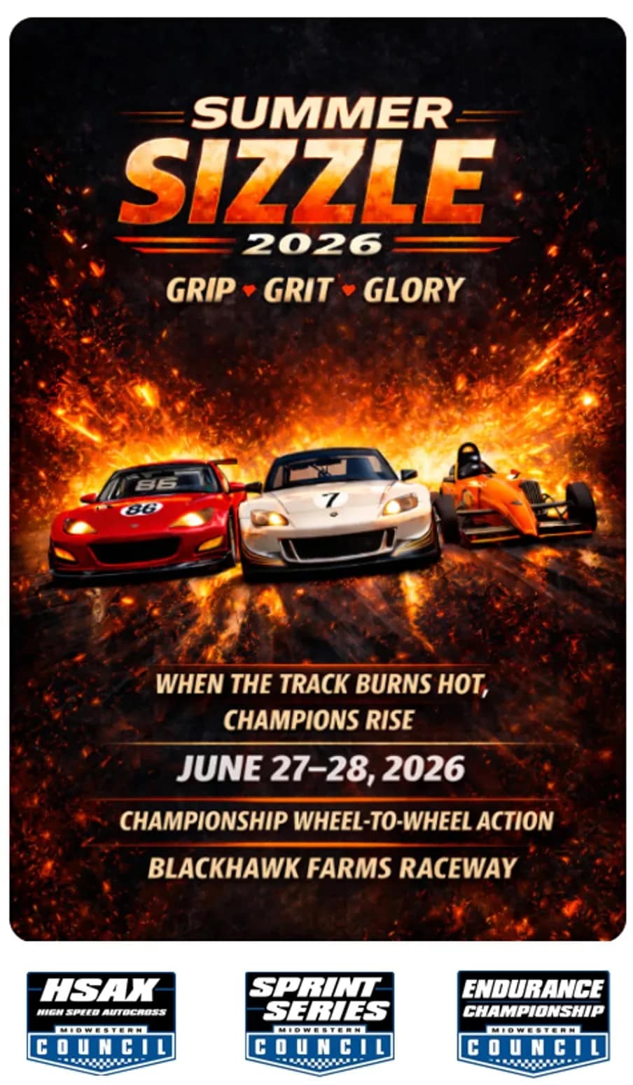 Midwestern Council (MCSCC, MC), Madison Sports Car Club (MSCC), along with Salt Creek Sports Car Club (SCSCC), are proud to present "Summer Sizzle", a full weekend of motorsports themed around the sounds, smells, and sights of summer racing! This weekend we're at Blackhawk Farms Raceway -- June 27-28, 2026. Join us for Midwestern Council HPDE/HSAX (High […] |